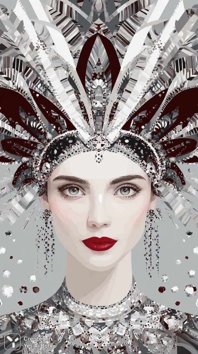 Загадочная красавица, чье лицо становится холстом для смелого и выразительного макияжа глаз, подчеркнутого яркой красной помадой. Взгляд приковывает внимание благодаря драматичной игре света и тени, а губы словно источают страсть и уверенность. Великолепный головной убор, украшающий голову модели, представляет собой настоящее произведение искусства – сложное переплетение черных и белых узоров, создающих завораживающий эффект движения и глубины. За спиной вихреобразные линии, словно застывшие в танце, добавляют композиции динамики и таинственности. Россыпь сверкающих драгоценных камней, разбросанная по всему образу, придает ему роскошь и неповторимый шарм, превращая портрет в ослепительное зрелище. Это воплощение женственности, силы и безудержной фантазии, где каждая деталь продумана до мелочей для создания незабываемого впечатления. Изображение излучает ауру загадочности и притягательности, пленяя взгляд своей красотой и элегантностью. В этом образе сочетаются классическая утонченность и современная дерзость, создавая уникальный стиль, который невозможно не заметить. Кажется, что эта женщина способна на все благодаря своему сильному характеру и неповторимому очарованию, а ее взгляд проникает в самую душу, заставляя задуматься о вечных тайнах красоты и любви