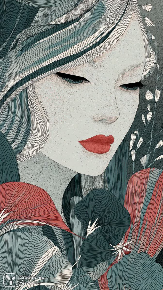 Загадочный женский портрет, исполненный в стиле сюрреализма, пленяет своей красотой и таинственностью. Выразительные черты лица подчеркнуты смелым акцентом – насыщенным красным цветом на губах, а сложный черно-белый макияж добавляет образу глубины и драматизма. Глаза прикрыты в немом выражении покоя, а струящиеся волосы создают ощущение легкости и воздушности. Фон картины представляет собой вихрь ярких красок и изысканных цветочных мотивов, формируя неповторимую атмосферу грез и фантазий. Это не просто изображение лица, это погружение в мир чувств и эмоций, где реальность переплетается с вымыслом, а красота обретает новые грани. Картина словно приглашает зрителя задуматься о природе женственности, загадочности человеческой души и силе искусства создавать удивительные образы. В ней сочетаются классическая композиция и новаторский подход к цветовому решению, делая ее поистине уникальным произведением искусства. Тонкие линии макияжа в контрасте с яркими цветами фона создают ощущение динамики и движения, а закрытые глаза словно скрывают глубокую тайну, которую предстоит разгадать зрителю. Это произведение – гимн красоте, фантазии и безграничным возможностям художественного самовыражения
