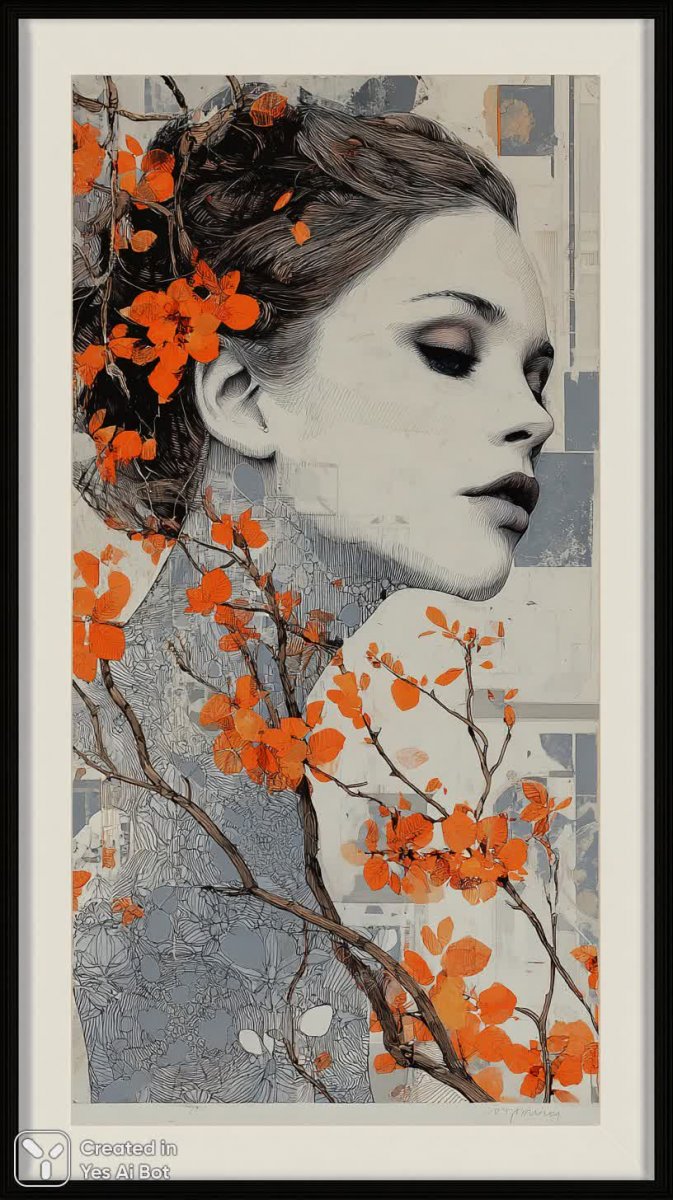 Изысканный портрет женщины, оживший на бумаге в технике графической иллюстрации. Лицо украшено яркими оранжевыми цветами и графичными черными полосами, создавая завораживающий контраст света и тени. Работа выполнена с акцентом на смелые линии и насыщенные цвета, погружая зрителя в атмосферу сюрреализма и роскоши. Фон, выполненный с особой тщательностью, придает изображению глубину и объем, подчеркивая красоту и загадочность женского образа. Кажется, будто это не просто рисунок, а окно в мир фантазий и мечтаний, где реальность переплетается с искусством, а обыденное становится необыкновенным. Детализированная проработка лица и цветочных элементов демонстрирует мастерство художника, позволяя взглянуть на привычный образ под совершенно новым углом. Это произведение искусства – гимн женственности, красоте и творческой свободе, способное вдохновить и заворожить любого зрителя своей оригинальностью и выразительностью. Насыщенная палитра цветов и необычные сочетания форм создают неповторимый визуальный эффект, делая этот портрет поистине незабываемым. Каждая линия, каждый штрих – часть сложной композиции, в которой гармонично сочетаются реализм и фантазия
