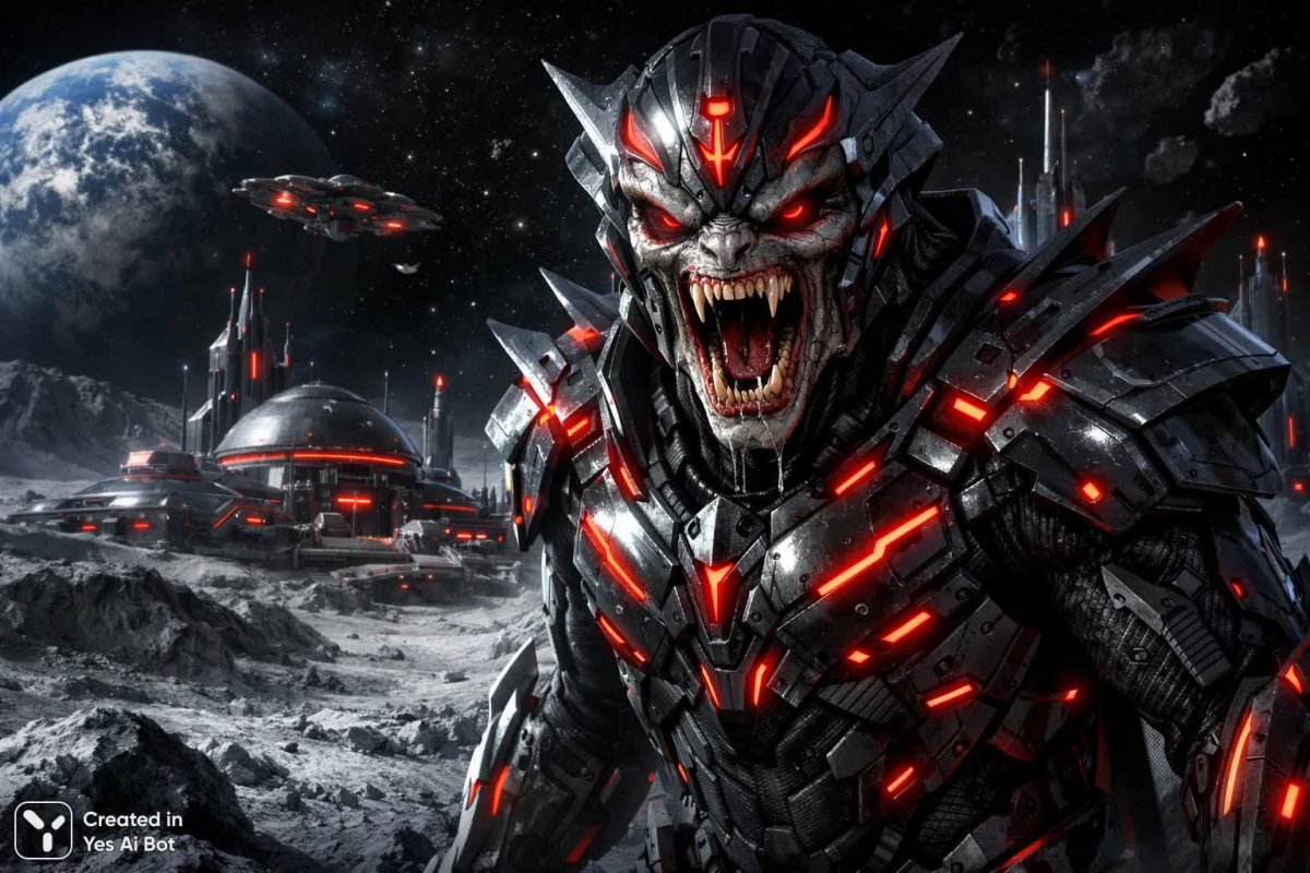 злой житель луны, хищный оскал пришельца, броня из будущего с не немногочисленными красными неоновыми линиями, лунный пейзаж, лунная база пришельцев.