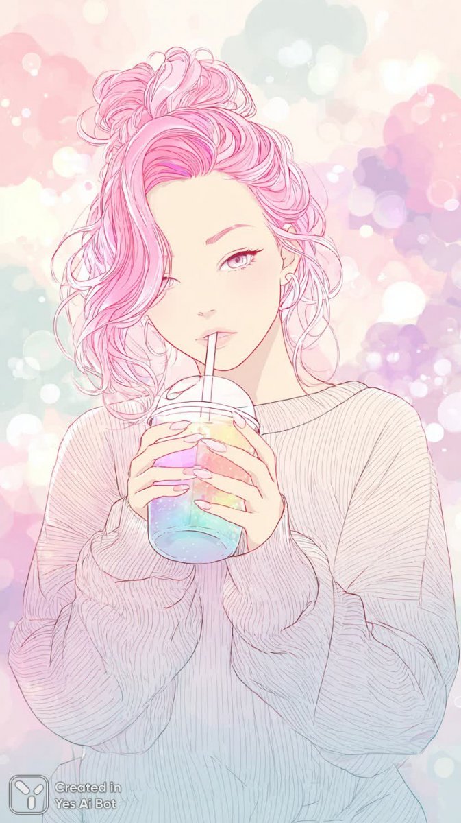 cartoon anime girl with vibrant pink hair, oversized sweater, sipping a colorful drink; BG: dreamy pastel clouds, cozy ambiance, soft bokeh lights, whimsical feel, high detail.