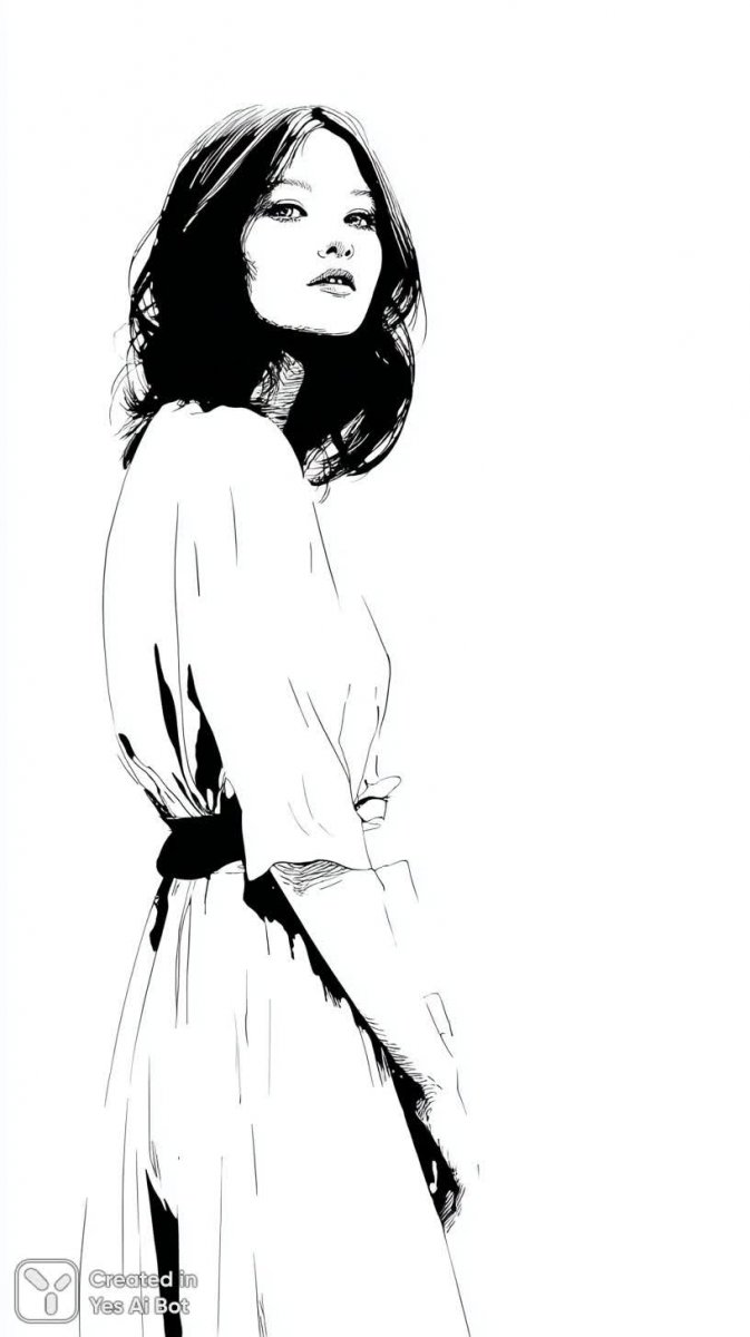 Изящный портрет молодой женщины в черно-белом рисунке, воплощающий утонченность и задумчивость. Лаконичный фон подчеркивает красоту линий и простоту композиции. Элегантное платье, расслабленные руки вдоль тела и выразительное лицо с глубоким взглядом передают атмосферу спокойствия и внутренней гармонии. Использование техники линейного рисунка и монохромной палитры создает эффект минимализма, акцентируя внимание на деталях и плавности форм. Кажется, будто застывшее мгновение позволяет зрителю проникнуть в мир размышлений этой хрупкой фигуры. Этот эскиз – не просто изображение, а скорее поэтическая интерпретация женственности, выраженная через чистые линии и отсутствие лишних деталей. Он излучает благородство и достоинство, демонстрируя мастерство художника в передаче эмоций посредством минимального набора инструментов. Черно-белая гамма добавляет портрету вневременной шарма, делая его универсальным произведением искусства, способным украсить любое пространство. В рисунке чувствуется легкая грусть и меланхолия, которые лишь усиливают очарование этой задумчивой красавицы. Это пример безупречной простоты и элегантности в искусстве графики, где каждый штрих имеет значение и создает неповторимый образ