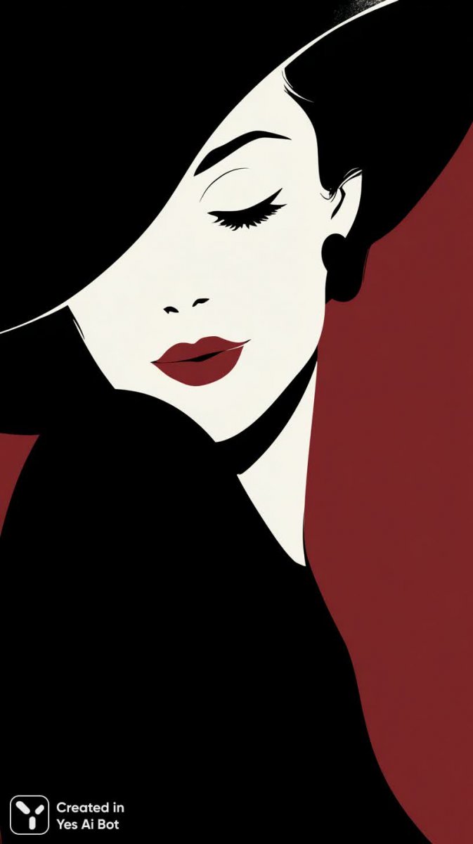 Изысканный портрет женщины в черно-белой гамме, где акцент смело расставлен ярко-красной помадой. Большой черный широкополый головной убор элегантно наклонен набок, придавая образу загадочности и шарма. Глаза прикрыты, словно во сне или в момент глубокой задумчивости, что добавляет портрету нежности и интимности. Стиль изображения выполнен в духе простого векторного искусства, с использованием четких линий и минималистичных форм, что подчеркивает лаконичность и современность композиции. Фон представляет собой графичный узор из черно-белых полос, акцентированных редкими мазками насыщенного красного цвета, создавая динамичную игру света и тени, которая гармонично дополняет образ женщины и придает ему завершенность. Это портрет, в котором классическая элегантность сочетается с современным стилем, а игра контрастов создает неповторимую атмосферу загадочности и утонченности. Образ излучает уверенность, спокойствие и безмятежность, пленяя своей простотой и изысканностью. Черно-белая основа усиливает драматизм и выразительность красной помады, делая ее главным акцентом всего изображения