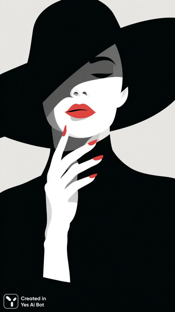 Изысканный портрет женщины в стиле минимализма, где акцент сделан на деталях и контрасте. На голове – большая черная шляпа, элегантно наклоненная, создающая ощущение загадочности и утонченности. Яркий мазок красного цвета подчеркивает маникюр безупречного состояния и чувственные губы, добавляя образу страсти и драматизма. Фон выполнен в виде плоских геометрических фигур черно-белой гаммы с деликатным намеком на красный оттенок, гармонично сочетающимся с акцентами на лице. Полосатый узор фона создает визуальный интерес и подчеркивает лаконичность композиции. Вся картина дышит спокойствием и уверенностью, демонстрируя идеальное сочетание простоты и роскоши. Это современный взгляд на классический портрет, где каждый элемент тщательно продуман для создания неповторимого впечатления. Женщина предстает как символ силы и независимости, окутанная аурой таинственности и стиля. Картина словно шепчет о скрытых желаниях и неуловимой красоте