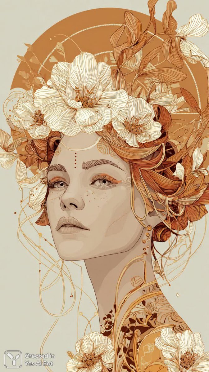 Изысканный портрет в духе сюрреализма изображает женщину, чья красота переплетается с фантастическими элементами. Её волосы украшены яркими оранжевыми цветочными мотивами, словно живой венок, создающий ощущение неземной грации и загадочности. Лицо подчеркнуто изысканным макияжем, акцентирующим взгляд и придающим образу особую гламурную привлекательность. В портрете гармонично сочетаются различные художественные стили: элементы ар-деко добавляют композиции нотку элегантности и утонченности, а замысловатые рисунки на теле создают ощущение сложной и многогранной красоты. Золотые и черные полосы, искусно вплетенные в образ, придают портрету глубину и визуальный интерес, подчеркивая его декоративность. Высокое разрешение иллюстрации позволяет рассмотреть каждую деталь, каждый штрих, передающий мастерство художника. Портрет словно оживает на холсте, завораживая зрителя своей красотой и загадочностью, погружая в мир фантазий и сновидений, где реальность переплетается с вымыслом. Это произведение искусства является настоящим гимном женской красоте и творческой свободе, воплощением элегантности и изысканности. Вся композиция создает ощущение таинственности и притягательности, заставляя задуматься о скрытых смыслах и символах