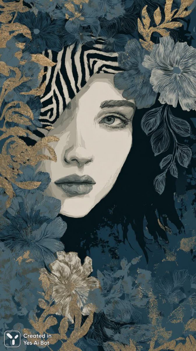 Изысканное женское лицо, словно распускающийся цветок, проступает сквозь буйство тёмных флоральных узоров и дерзкие полосы зебры, создавая завораживающий контраст. Тончайшая тушёная графика, выполненная чернилами, подчёркивает роскошь золотых акцентов, придавая композиции неповторимый шик. Вся работа пропитана духом современности и пленит своей притягательностью, сочетая в себе элементы классической изысканности и смелых дизайнерских решений. Это визуальный гимн женской красоте, где каждый штрих несёт в себе заряд элегантности и уверенности. Влияние графики добавляет глубину и текстуру, а игра света и тени создаёт ощущение объёма и реалистичности. Картина излучает утончённый вкус и демонстрирует мастерство исполнения, являясь ярким примером современного художественного выражения. Она способна притянуть взгляд и заставить задуматься о красоте, силе и загадочности женского образа. Это не просто портрет, это воплощение стиля и эстетики, гармонично сочетающее в себе различные элементы дизайна