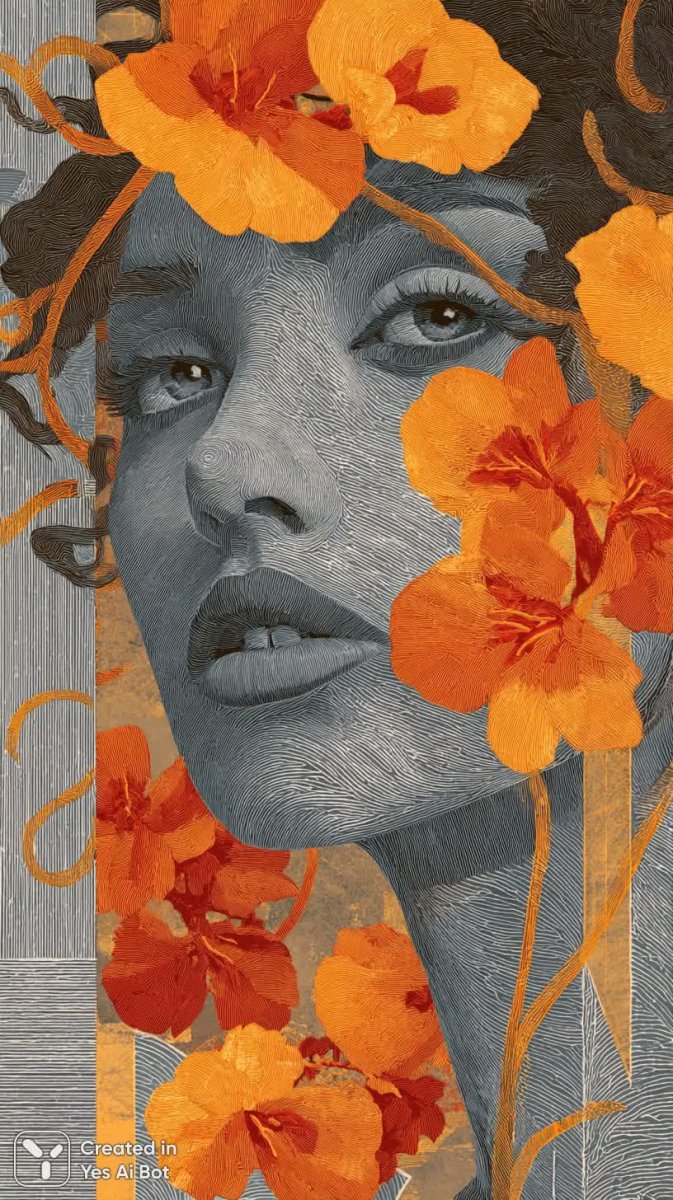 Восхитительный портрет современной женщины, воплощенный в ярком стиле поп-арт с гиперреалистичными деталями. Лицо модели становится холстом для буйства красок и форм – оранжевые цветы нежно обрамляют ее черты, а неоновые вихри добавляют динамики и загадочности образу. Фон выполнен в серой гамме, что позволяет акцентировать внимание на выразительном лице и красочных элементах декора. Текстура изображения завораживает: каждый лепесток цветка прорисован с невероятной точностью, а переплетение неоновых линий создает ощущение движения и энергии. Использование различных паттернов в деталях придает работе глубину и многослойность. Это не просто портрет – это визуальная поэзия, сочетающая в себе классическую красоту и современное художественное видение. Вся композиция пронизана ощущением оптимизма и жизненной силы, словно передавая позитивный настрой модели. Яркие цвета и смелые формы делают эту работу запоминающейся и привлекающей внимание. Это произведение искусства способно украсить любое пространство, наполняя его атмосферой креативности и вдохновения. Техника исполнения демонстрирует высокий уровень мастерства художника, сумевшего гармонично объединить различные элементы в единое целое