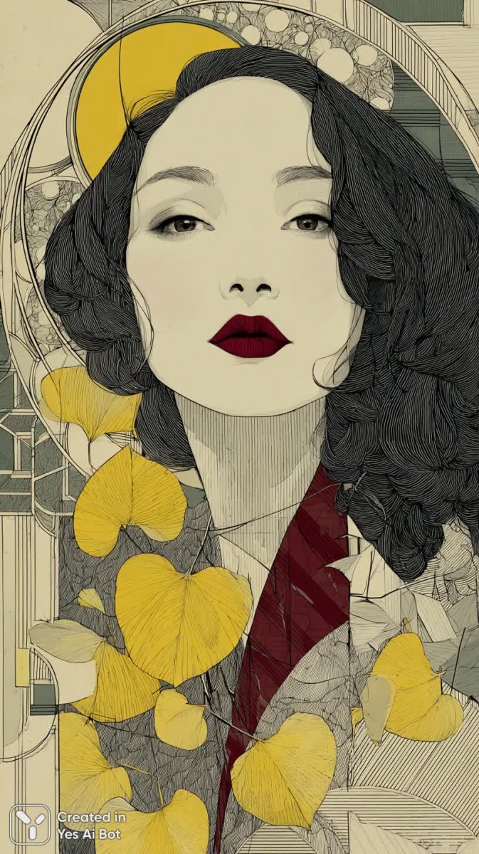 striking beauty with black hair and red lipstick, framed by yellow and black floral motifs, illustrated with geometric shapes and lines, luxurious details, ink drawing.