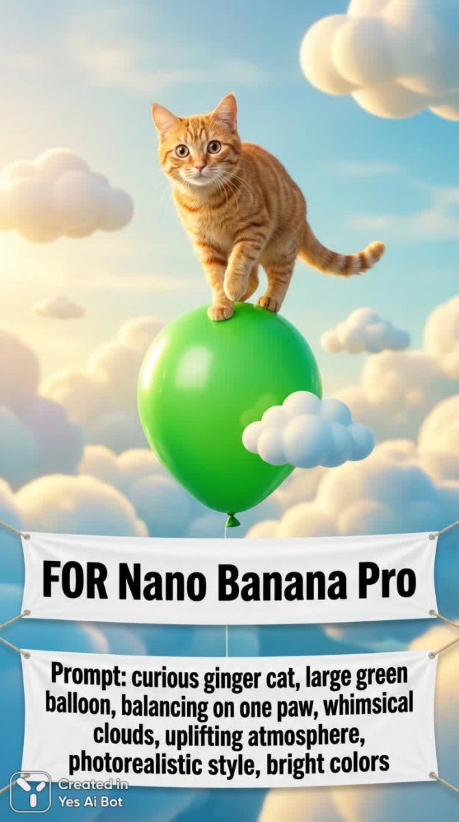bold black text on white bunner: "FOR Nano Banana Pro" AND bold black text on white bunner: "Prompt: curious ginger cat, large green balloon, balancing on one paw, whimsical clouds, uplifting atmosphere, photorealistic style, bright colors"
