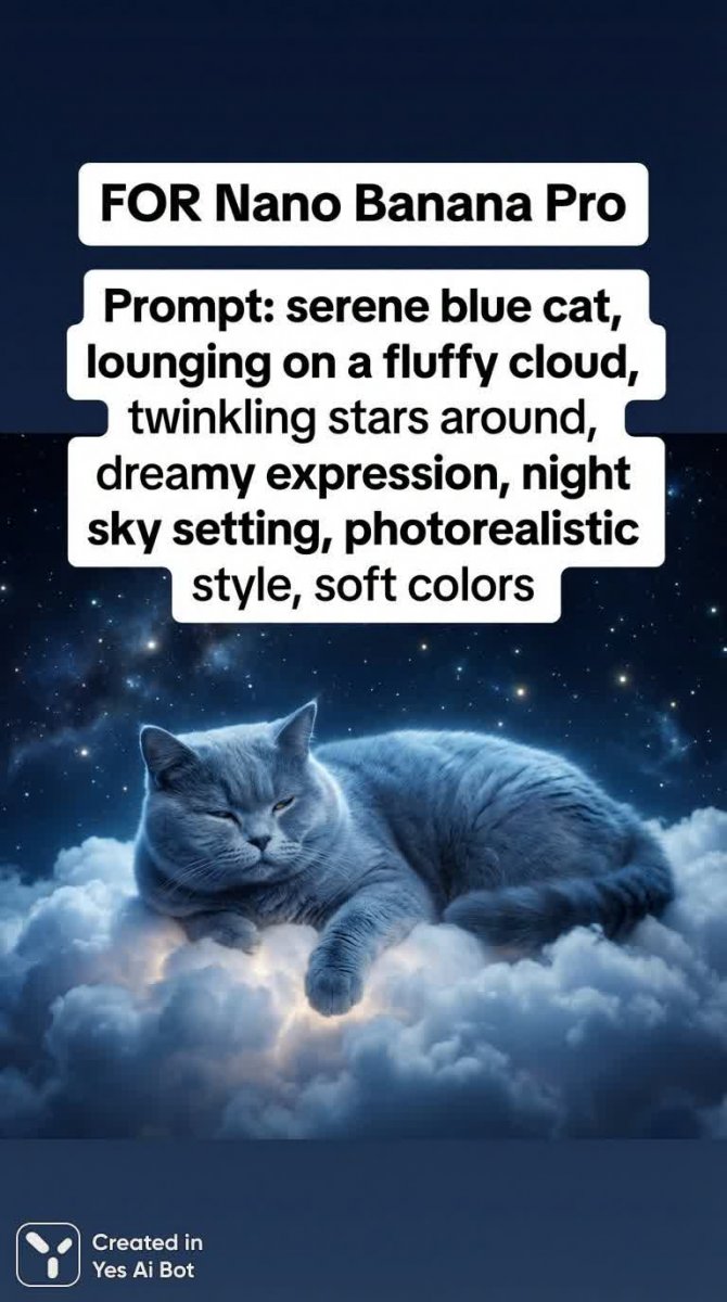 bold black text on white bunner: "FOR Nano Banana Pro" AND bold black text on white bunner: "Prompt: serene blue cat, lounging on a fluffy cloud, twinkling stars around, dreamy expression, night sky setting, photorealistic style, soft colors"