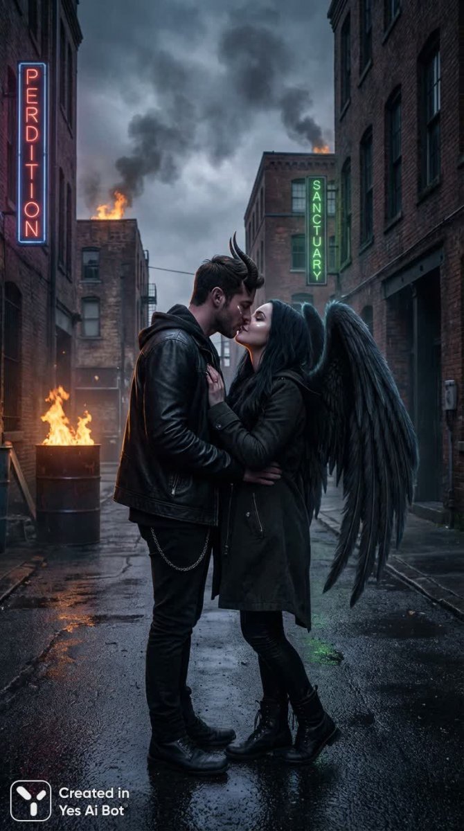 nanobanana Темная страсть: поцелуй ангела и демона в городе. Картинка из нейросети Нано Банана