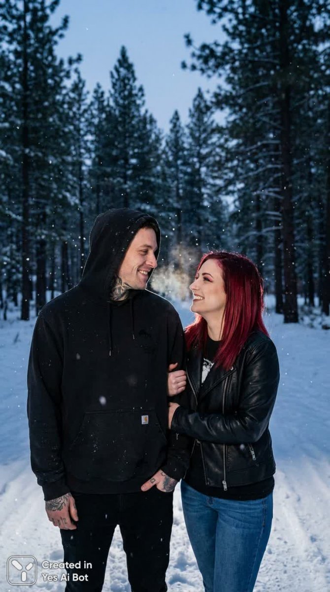 Захватывающая фотография, передающая искренние чувства и глубокую связь между двумя молодыми людьми. В центре композиции – мужчина в черном худи, украшенном татуировками, и девушка с огненно-рыжими волосами и брюками, воплощающие бунтарский дух. Их лица выражают нежность и любовь, а поза демонстрирует близость и доверие. Снежный пейзаж создает атмосферу уединенности и романтики, подчеркивая интимность момента. Идеально проработанные детали, реалистичная передача текстур и света, свидетельствуют о профессиональном уровне фотографа. Каждый элемент изображения – от татуировок на теле мужчины до алых прядей волос девушки – создает целостную историю о настоящей любви, преодолевающей любые преграды. Фотография обладает невероятной эмоциональной силой, заставляя зрителя сопереживать героям и ощущать тепло их чувств даже сквозь холодный зимний пейзаж. Это не просто снимок, а настоящее произведение искусства, запечатлевшее мимолетное мгновение счастья и взаимности. Качество исполнения настолько высокое, что кажется, будто можно почувствовать мороз на щеках и услышать тихий шепот ветра. Вся композиция пронизана атмосферой искренности и подлинности, делая это изображение поистине незабываемым
