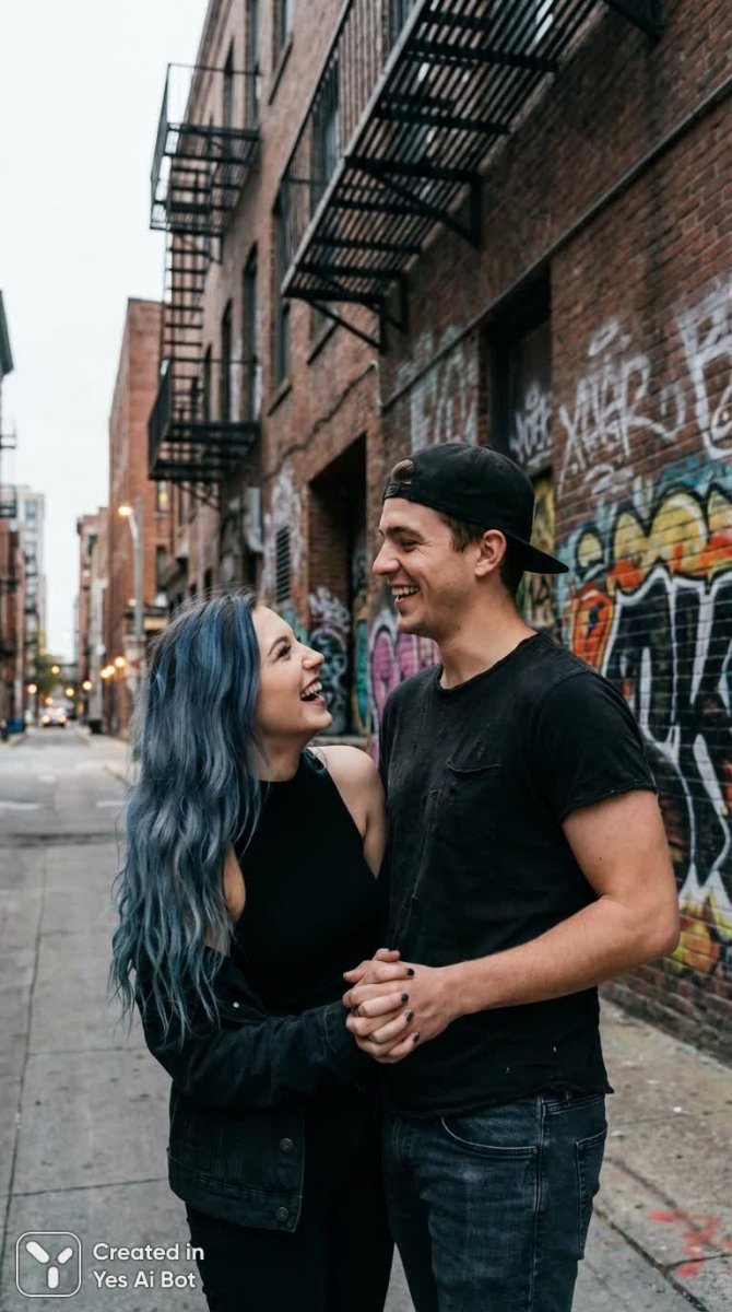 Изображение демонстрирует молодую пару в городской обстановке, излучающую радость и беззаботность. Девушка с длинными голубыми волосами одета в черный кроп-топ, а парень - в бейсболку и рваные джинсы, создавая стильный и запоминающийся контраст с урбанистическим фоном. Фотореалистичный стиль изображения подчеркивает мастерство исполнения: каждая деталь, от текстуры ткани до игры света в волосах, проработана с невероятной точностью. Композиция фокусируется на естественности момента и эмоциональной связи между героями, создавая ощущение динамичности и современности благодаря городскому пейзажу на заднем плане. Яркие цвета волос девушки и потертости джинсов парня добавляют индивидуальности их образу. Работа идеально подходит для рекламы модной одежды, аксессуаров, а также оформления социальных сетей и блогов, передавая атмосферу юности, свободы и позитива. Визуальный образ привлекает внимание и вызывает приятные эмоции благодаря своей легкости и искренности запечатленного момента радости. Использование нейросети NanoBanana v.1.0 Pro позволило достичь высокого уровня профессионализма в создании этого фотореалистичного изображения.