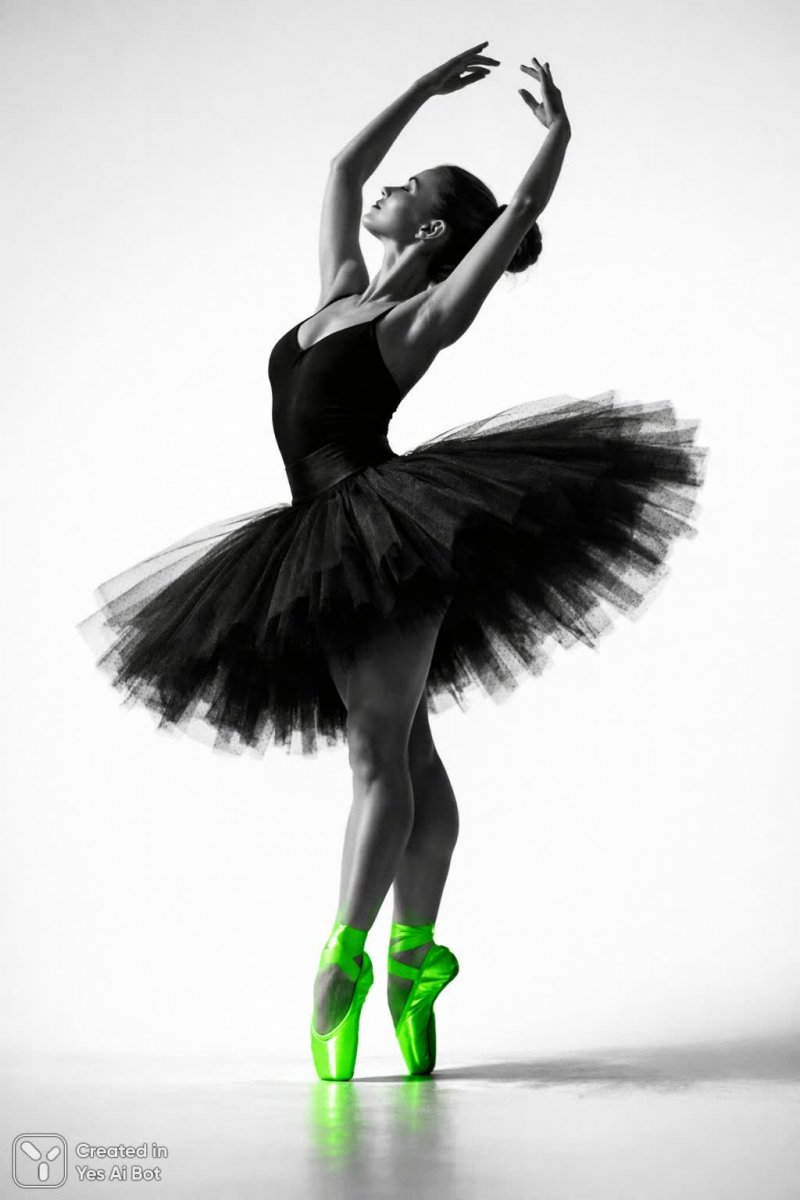 Изящная поза балерины в черно-белом фотопортрете завораживает своей красотой и силой. Тонкие пальцы ног, устремленные в одной точке равновесия, создают ощущение легкости и невесомости, несмотря на напряжение, запечатленное в каждом мускуле. Яркий неоновый акцент обуви для пуант контрастно выделяется на фоне классического черного силуэта пачки, подчеркивая современный взгляд на традиционное искусство балета. Руки балерины, словно крылья, устремлены вверх, выражая стремление к совершенству и гармонии. Строгий пучок волос добавляет образу строгости и сосредоточенности, а нейтральный белый фон позволяет зрителю полностью погрузиться в красоту и грацию танцовщицы. Высокое разрешение снимка, сделанного на профессиональную камеру Nikon D850 с объективом 85mm f/1.4, передает мельчайшие детали – от текстуры ткани пачки до блеска пота на коже балерины. Съемка снизу подчеркивает высоту и величие танцовщицы, создавая драматический эффект. Фотография излучает энергию и страсть, запечатлевая момент абсолютной концентрации и мастерства. Это не просто портрет балерины – это гимн красоте движения, силе духа и бесконечной преданности искусству танца. Каждое движение застыло во времени, чтобы подарить зрителю возможность восхититься совершенством человеческого тела и выразительностью искусства