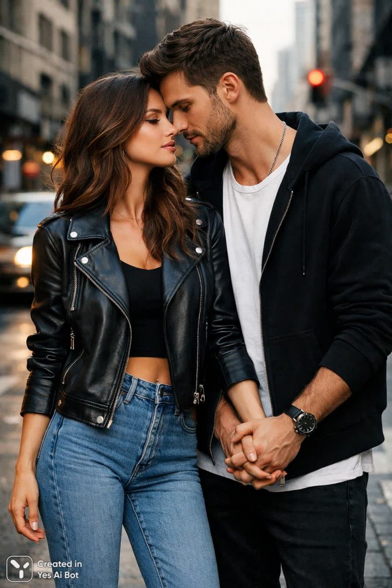 couple in romantic pose, girl in black leather jacket and ripped jeans, man in white t-shirt and black hoodie, both holding hands, urban street bg, photorealistic, professional photo.