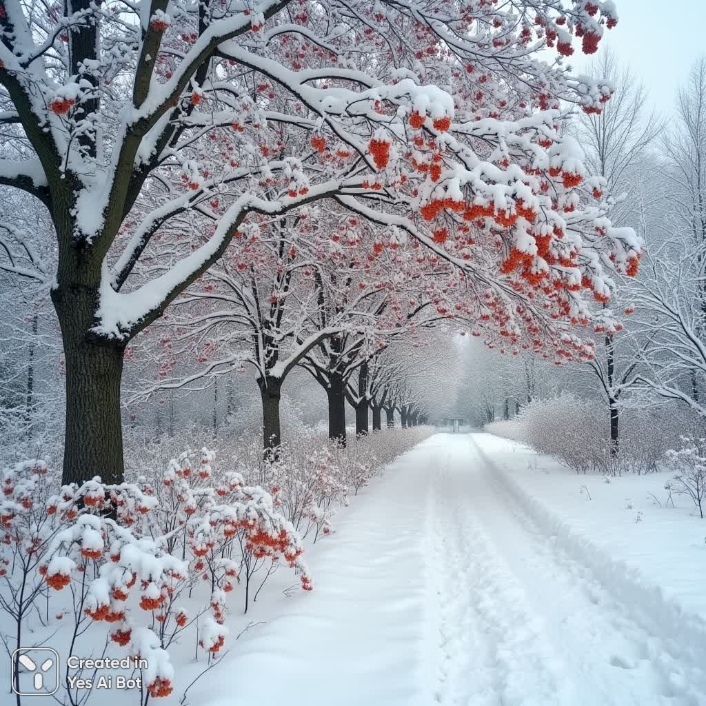 Зимнее безмолвие рябины и вишни под снегом - Картинка, созданная ИИ Flux.1