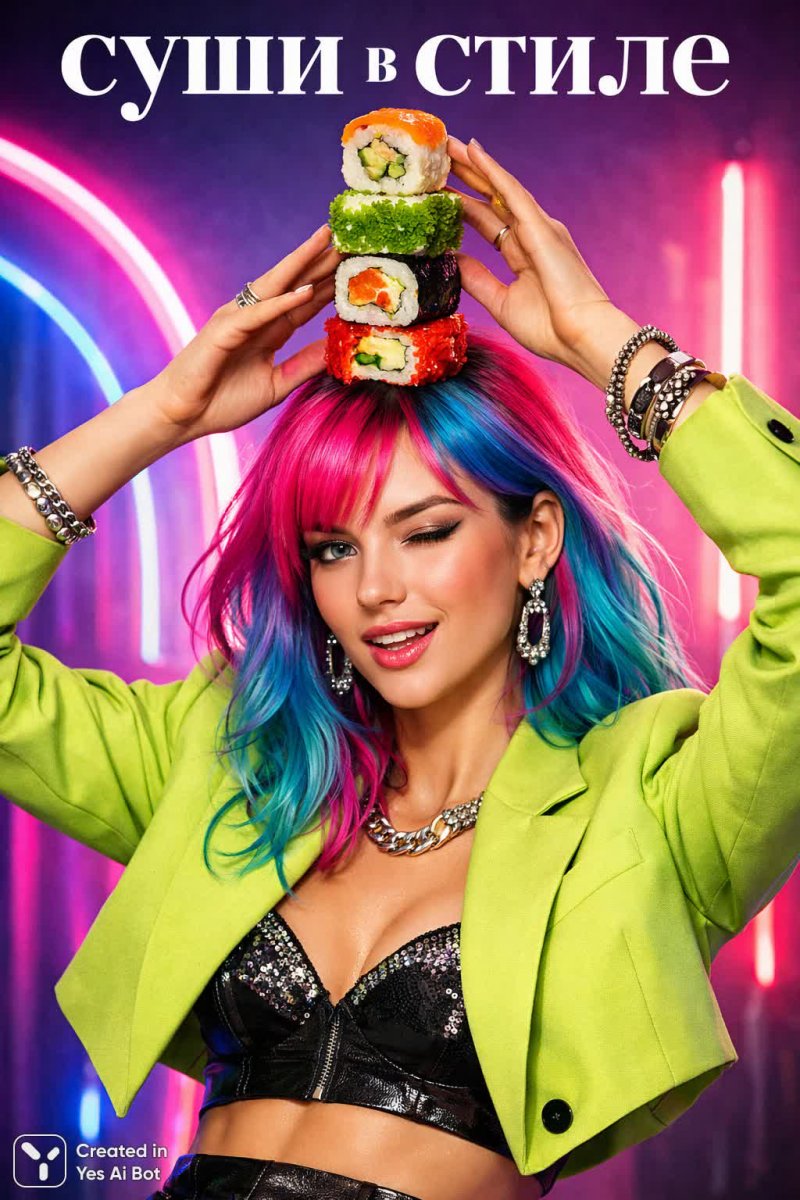 trendy young lady with vibrant hair, playfully stacking colorful sushi rolls on her head, wearing a fashionable outfit, bright neon background adding a playful twist, "Суши в стиле"