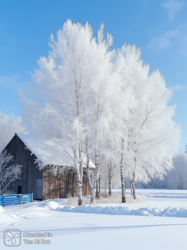 Заснеженная зимняя пасторальная сцена, где в центре композиции выстроилась группа стройных берез, словно застывшие в танце под покровом белоснежного инея. Каждая ветка украшена замысловатой сетью хрупких кристалликов, создавая неповторимую кружевную вуаль на фоне бездонного голубого неба. Сквозь прозрачную завесу инея проглядывает старинное деревянное строение с покатым крышей, хранящее в себе отпечаток времени и уюта. Его грубая текстура дерева добавляет контраста изящной легкости заснеженных ветвей. В нижнем левом углу едва заметен фрагмент синего забора – намек на присутствие человека в этом диком великолепии природы. Ракурс съемки, выбранный с небольшой нижней точки, позволяет охватить всю панораму пейзажа, подчеркивая гармоничное сочетание природных и рукотворных элементов. Яркое, чистое освещение раскрывает насыщенные оттенки лазурного неба и ослепительную белизну инея, словно акцентируя внимание на каждой детали зимней сказки. Вся картина пронизана атмосферой покоя и безмятежности, передавая умиротворение и тишину зимнего дня. Естественность изображения подчеркивается отсутствием лишних деталей, что позволяет зрителю полностью погрузиться в красоту простоты и чистоты зимней природы. Это не просто фотография – это запечатленная мгновенная гармония между небом, землей и деревьями, застывшая во времени и дарящая ощущение внутреннего спокойствия. Кажется, будто слышишь тихий шепот ветра в снежных ветвях и чувствуешь морозную свежесть зимнего воздуха
