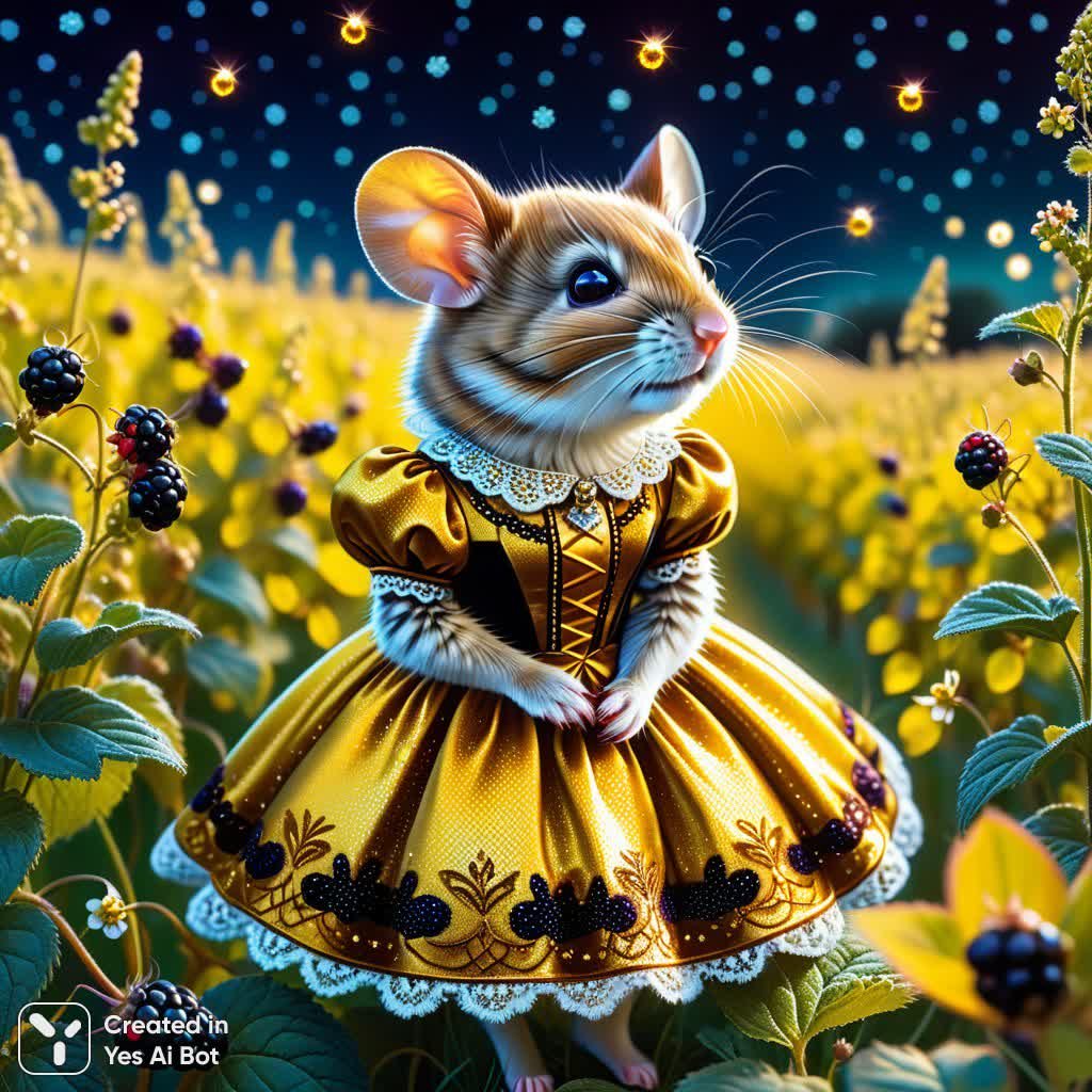 Изящная мышь в роскошном наряде, словно сошедшая с полотен старинных мастеров, обитает в волшебной черноплодной роще. Ее крошечный стан облачен в бархатно-золотое платье и нежнейшее кружевное одеяние, подчеркивающее ее пушистость и очарование. Окружающий мир наполнен сказочным сиянием мерцающих светлячков, создавая атмосферу невероятной красоты и умиротворения. Искусство моне привносит в эту сцену легкость и воздушность, а техники точечной микрографии, росписи алмазами и виноградных лоз добавляют детализации и глубины, словно оживляя каждую травинку и каждый лепесток. Эта миниатюрная фея, воплощение нежности и элегантности, пленяет своей хрупкостью и вызывает чувство восхищения перед чудесами природы и мастерством художника, создавшего этот волшебный образ. Ее присутствие в этой идиллической местности кажется символом гармонии и красоты, способной вдохновить на творчество и наполнить сердце радостью. Эта картина – настоящий шедевр, сочетающий в себе изысканность, детализацию и сказочную атмосферу