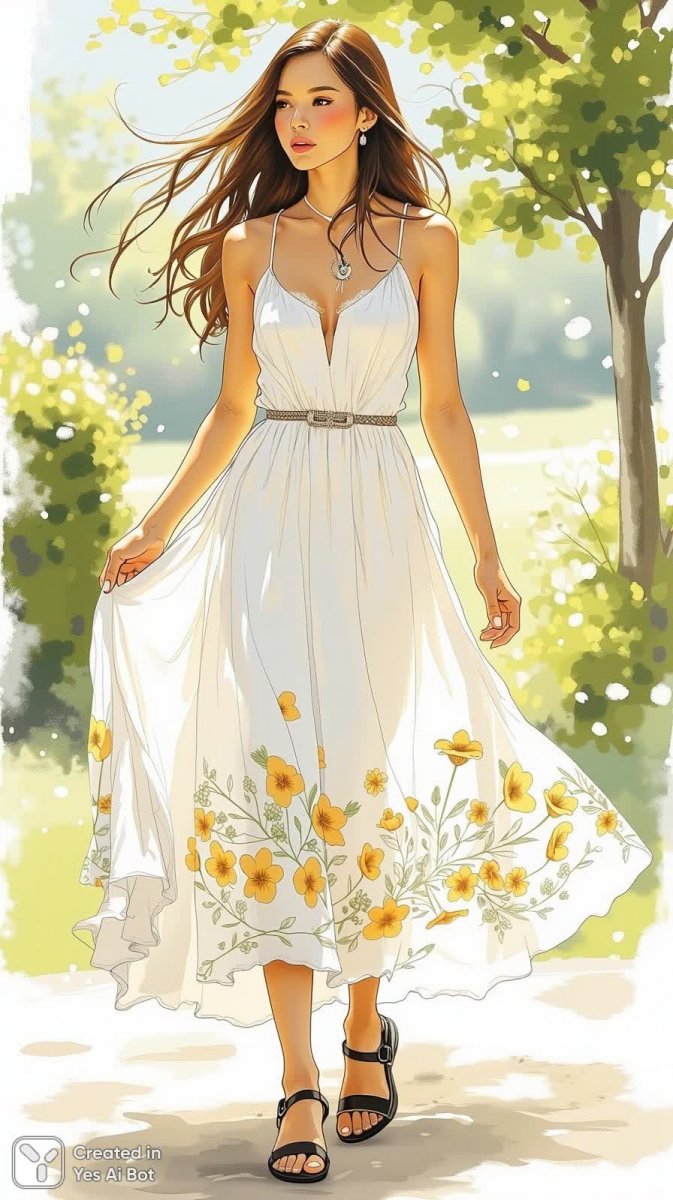 Изящная акварельная иллюстрация моды изображает женщину в невесомом белом платье-сарафане, воплощающем легкость и летнее настроение. Акцент сделан на приталенном лифе с вырезом 'сердечко', подчеркивающим женственность силуэта. Пышная юбка украшена нежным цветочным узором, добавляя образу романтичности и очарования. На ногах – элегантные черные сандалии на ремешках, которые гармонично дополняют общую цветовую гамму. Длинные волосы свободно ниспадают по плечам, создавая ощущение движения и свободы. Фон представляет собой солнечное открытое пространство с мягкой зеленью, усиливающее впечатление умиротворения и естественной красоты. Вся композиция пронизана атмосферой безмятежности и легкости, передающей дух летней моды и женской грации. Это не просто иллюстрация – это визуальная поэзия, запечатлевшая момент солнечного света и летнего настроения, идеально подходящая для рекламы модных брендов или создания декоративного элемента в интерьере. Работа выполнена с использованием акварельной техники, что придает ей особую мягкость и воздушность, подчеркивая деликатность женского образа и передавая атмосферу тепла и света