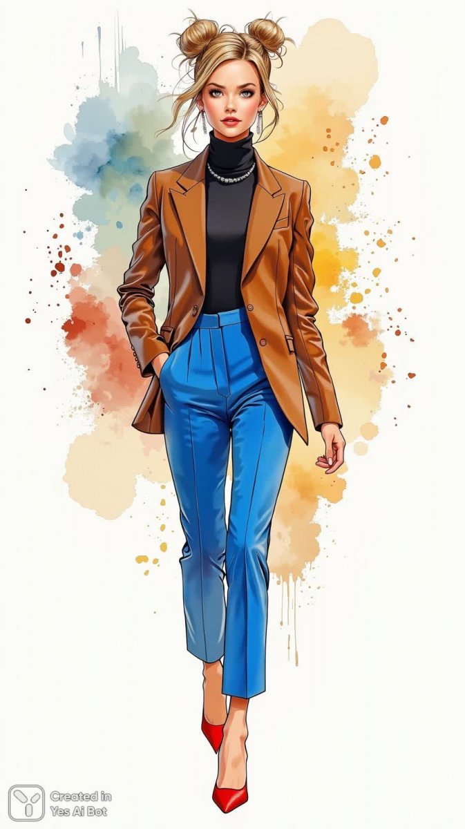 Изящная мода оживает на холсте в этой акварельной иллюстрации. В центре внимания – уверенная женщина, воплощающая элегантность и стиль. Она грациозно идет вперед, облаченная в безупречный приталенный блейзер, подчеркивающий ее фигуру. Высоко посаженные брюки насыщенного синего цвета добавляют образу динамичности и современности. Под блейзером скрывается лаконичный черный водолазка, создающий гармоничный контраст с ярким низом. Завершают образ эффектные красные туфли-лодочки на шпильке, придающие походке легкость и изящество. Прическа женщины выполнена в виде элегантного пучка, который притягивает внимание к ее лицу и подчеркивает утонченность черт. Фон иллюстрации представляет собой абстрактную композицию, наполненную яркими всплесками красок, которые создают ощущение движения и энергии. Цвета перетекают друг в друга, формируя живописный фон, который усиливает эффект присутствия и создает атмосферу творчества. Эта иллюстрация – ода женственности, уверенности и безупречному вкусу. Она передает дух современной моды, сочетая классические элементы с яркими акцентами и абстрактным фоном. Каждая деталь продумана до мелочей, создавая гармоничный и запоминающийся образ, который вдохновляет на самовыражение и подчеркивает индивидуальность. Это не просто иллюстрация, а произведение искусства, которое воплощает красоту и стиль в ярких акварельных красках. Она способна украсить любое пространство и подарить ощущение радости и вдохновения