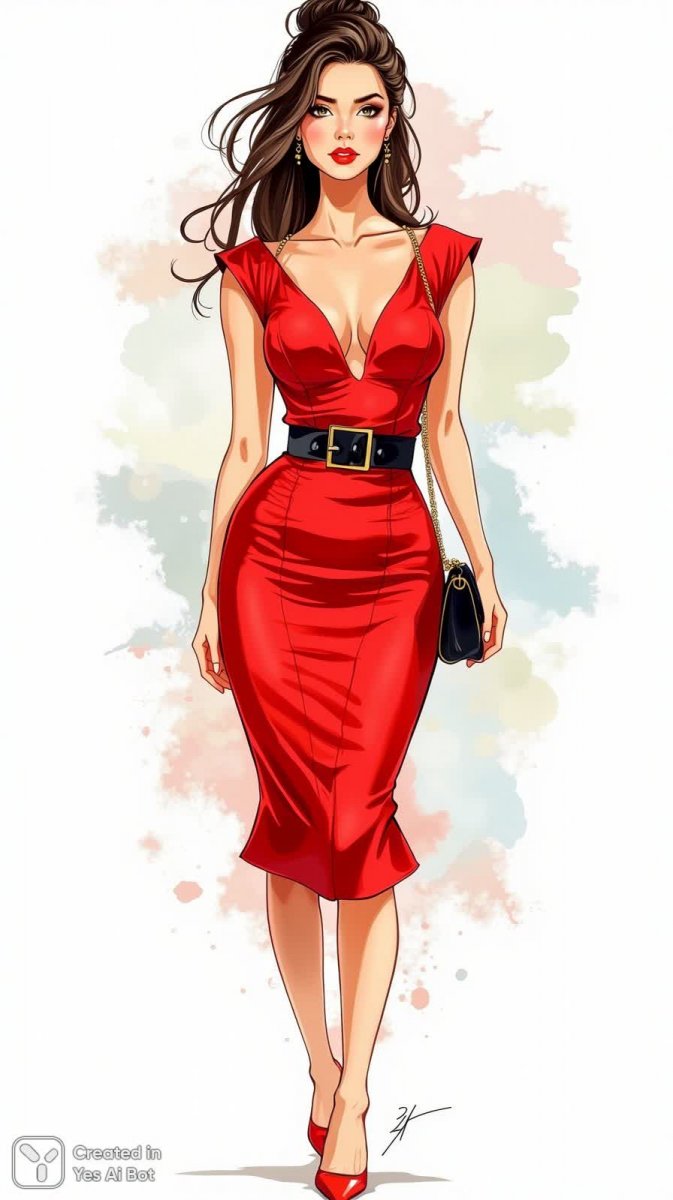 Изысканная мода оживает в этом иллюстративном портрете женщины, воплощающей элегантность и утонченность. В центре внимания – облегающее красное платье миди с глубоким V-образным вырезом и рукавами-кап, подчеркнутое широким черным поясом, который акцентирует талию и создает гармоничный силуэт. Темные волосы, собранные в классическую высокую прическу, добавляют образу завершенности и изысканности, а смело нанесенная красная помада – яркий штрих, подчеркивающий чувственность и уверенность. Фон нейтрального белого цвета позволяет полностью сосредоточиться на модели и деталях ее наряда, усиливая впечатление роскоши и стиля. Эта иллюстрация является настоящим гимном женственности и безупречному вкусу, демонстрируя гармонию цветов и линий в мире высокой моды. Она словно запечатлевает момент триумфа элегантности, вдохновляя своей простотой и изысканностью на создание собственных неповторимых образов. Каждая деталь продумана до мелочей, от кропотливой прорисовки ткани до выразительного взгляда модели, что делает эту иллюстрацию настоящим произведением искусства