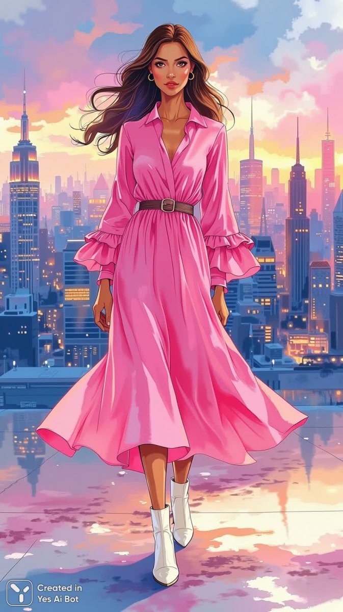 Изящная мода оживает на полотне в этой завораживающей иллюстрации. В центре внимания – женщина, облаченная в яркое малиновое платье миди, которое притягивает взгляд своей насыщенностью и элегантностью. Платье отличается деликатной драпировкой рукавов, украшенных нежными рюшами, а силуэт подчеркнут аккуратным поясом, создающим женственный акцент на талии. Дополняют образ белоснежные ботильоны до щиколотки, добавляющие легкости и воздушности всей композиции. Прическа героини – это волшебство свободных локонов, ниспадающих мягкими волнами, придающими ей романтический вид. Задний план иллюстрации – мечтательный городской пейзаж на закате, окутанный сумеречной дымкой. Городские огни мерцают и переливаются, создавая атмосферу сказки и таинственности. Этот фон идеально подчеркивает красоту и изящество модели, а также добавляет изображению глубины и объема. Картина передает ощущение утонченности и роскоши, воплощая в себе дух высокой моды и вдохновение творчеством иллюстратора. Это не просто изображение одежды – это история о женственности, грации и неповторимом стиле. Вся композиция дышит легкостью и красотой, приглашая зрителя окунуться в мир модных фантазий и эстетического наслаждения. Иллюстрация излучает позитив и вдохновение, демонстрируя гармонию между одеждой, стилем и окружающей средой