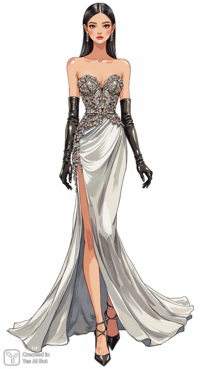 4. fashion illustration of woman in flowing metallic silver gown with high slit, intricately designed strapless bodice, paired with sleek black gloves and stiletto heels, long hair styled straight and sleek, BG is minimalist white, capturing a glamorous night out style.