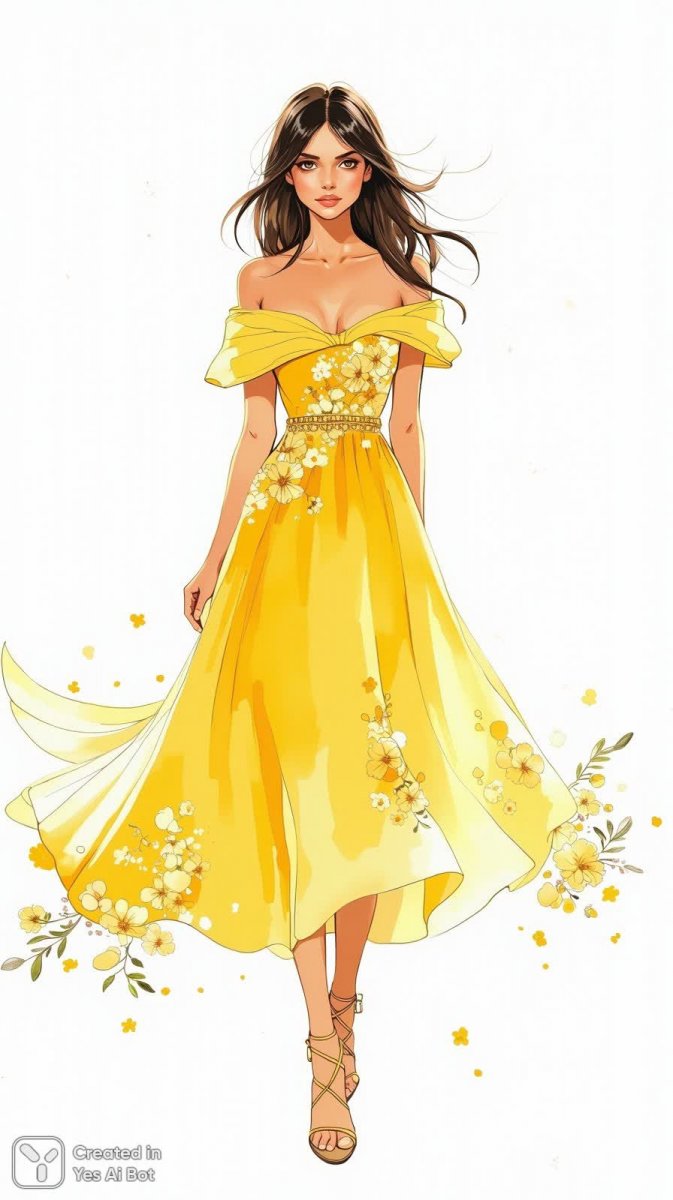 Изящная мода: завораживающая иллюстрация женщины в ярко-желтом платье миди с открытыми плечами. Богато декорированный корсет подчеркивает фигуру, а ниспадающая юбка струится до щиколоток, украшенная деликатным цветочным орнаментом. Золотые сандалии на тонких ремешках добавляют образу элегантности и блеска. Длинные темные волосы, волнами обрамляющие лицо, придают портрету воздушность и женственность. Простой белый фон позволяет сосредоточиться на красоте модели и деталях ее наряда, создавая атмосферу утонченности и изысканности. Эта иллюстрация – воплощение летней легкости и модной элегантности, демонстрирующее мастерство художника в передаче текстуры ткани и светотени. Каждое движение юбки, каждый завиток волос, каждая деталь украшения продумана до мелочей, создавая ощущение живого движения и неповторимого стиля. Это не просто изображение одежды – это история о красоте, уверенности и гармонии с собой. В этом образе сочетаются яркость цвета, изящество линий и деликатность деталей, создавая поистине незабываемое впечатление