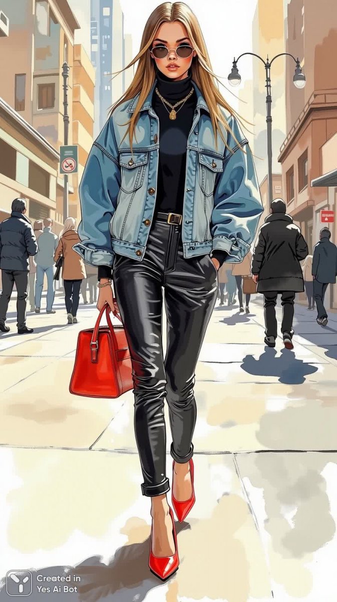 Стильная иллюстрация моды демонстрирует современный городской образ женщины. В центре внимания – элегантная фигура в объемной джинсовой куртке, которая контрастирует с облегающим черным водолазком и высокими кожаными брюками. Акцент на безупречном вкусе расставляют эффектные красные туфли-лодочки на массивном каблуке. Длинные волосы, аккуратно уложенные в гладкий прямой стиль, дополняют общий ансамбль, придавая ему изысканность и уверенность. Фон изображает оживленную городскую улицу, создавая атмосферу непринужденной, но при этом ультрамодной эстетики. Эта иллюстрация идеально передает дух современной уличной моды – сочетание комфорта, практичности и безупречного стиля, отражающего последние тенденции в мире высокой моды. В ней чувствуется динамика большого города и индивидуальность женщины, уверенно выбирающей свой путь. Это не просто наряд, это заявление о себе, воплощенное в ярких деталях и гармоничном сочетании цветов и фактур. Каждая деталь тщательно продумана, чтобы создать образ, который одновременно привлекает внимание и остается вне времени. Иллюстрация вдохновляет на эксперименты со стилем и поиск собственного неповторимого образа, отражающего внутреннюю красоту и уверенность в себе
