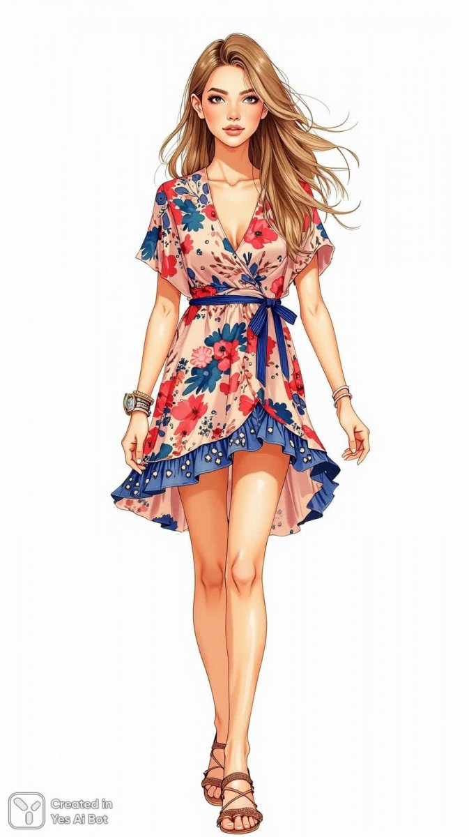 5. fashion illustration woman in playful printed wrap dress with ruffled hem, knee-length, wearing strappy sandals, tousled hair cascading down her shoulders, standing casually, BG is plain white, evoking a fun and lively atmosphere.