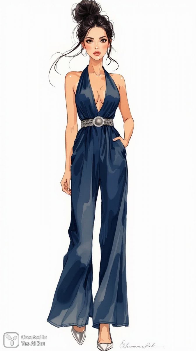 3. fashion illustration woman in elegant navy jumpsuit, with plunging neckline and wide legs, cinched at waist with a metallic belt, wearing silver high heels, long dark hair styled in a messy bun, BG is simple white, embodying modern sophistication.