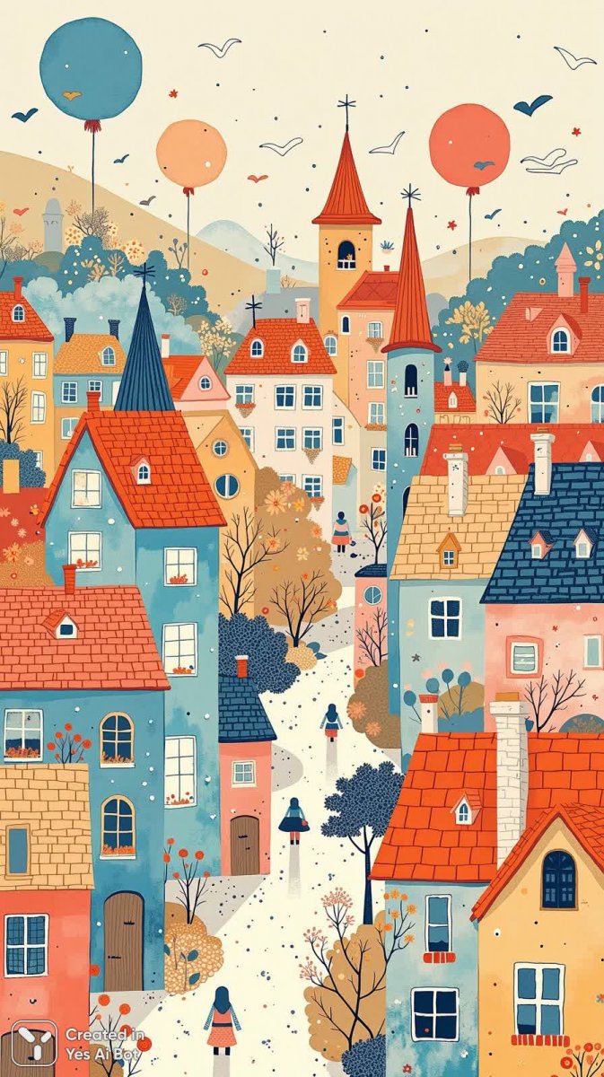 Очаровательный город в народном стиле: радость и воображение в пастельных тонах - Изображение, созданное нейросетью Flux 1