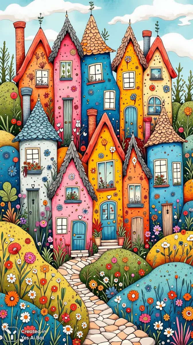 1. illustration of whimsical houses on a hillside, vibrant colors and intricate patterns, zentangle style with charming flowers blooming around.