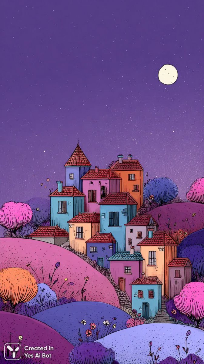 doodling of a cozy village with colorful cartoon houses surrounded by trees and flowers, set against a purple sky at night, capturing a charming fairy-tale atmosphere.