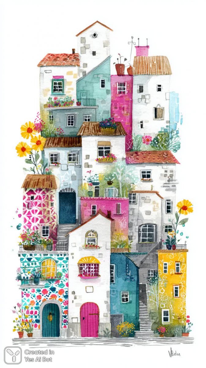 folk art watercolor painting of beach cottages with vibrant patterns, cheerful flowers, and whimsical details, capturing the warmth and joy of a colorful seaside town.