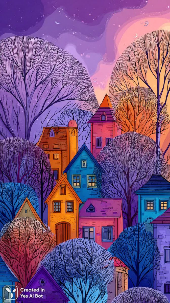colorful zentangle landscape with playful houses, bright trees, and a dreamy purple sky, infused with elements of digital art and intricate patterns.