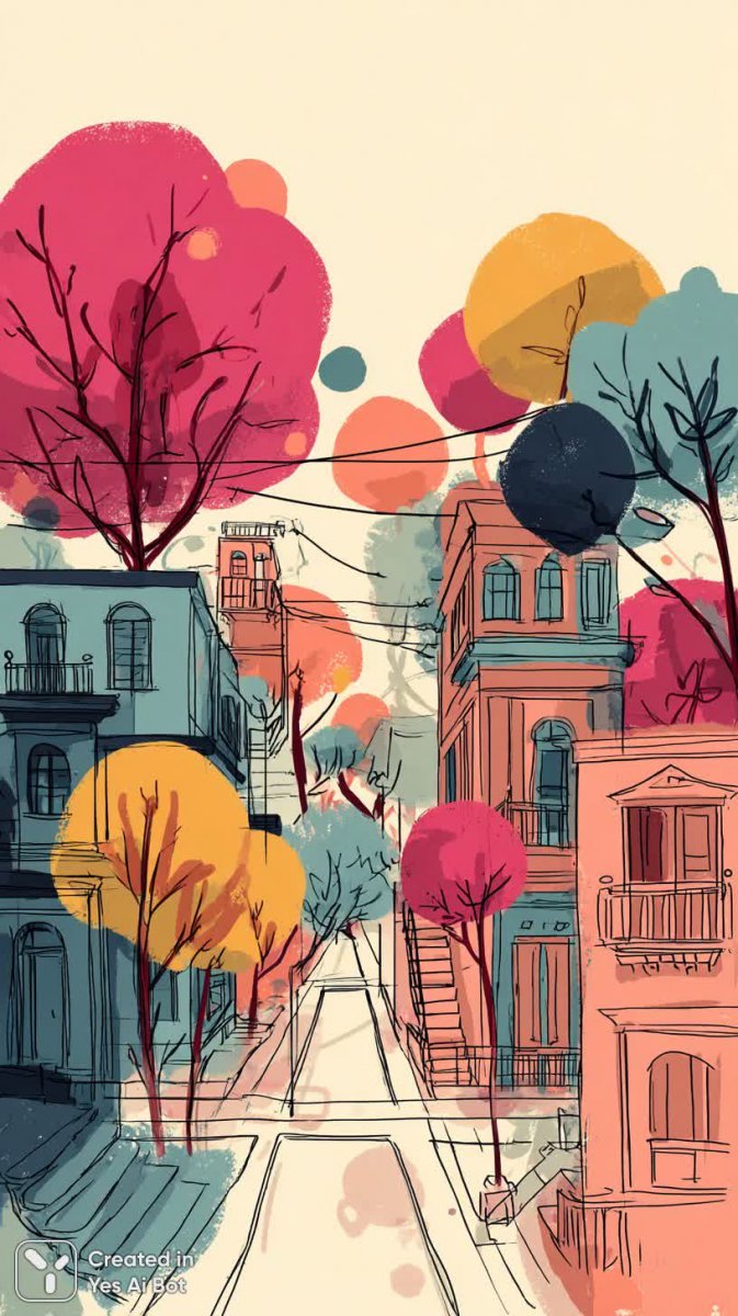 Яркая улица в акварельном рисунке: сказочный город и радостное настроение - Картинка, полученная с помощью нейросети Midjourney