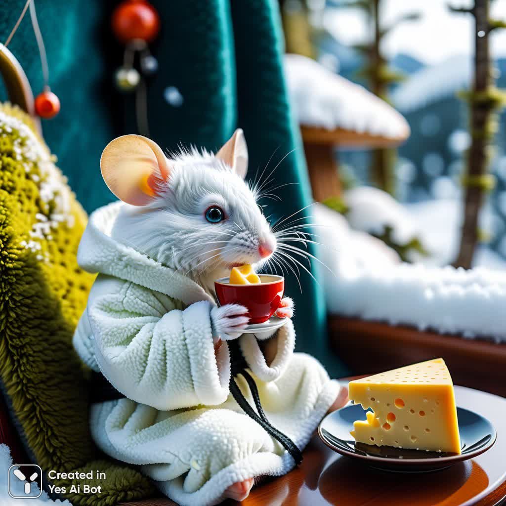 Милый пушистый белый мышонок в уютном халатике и шапочке с ушками, обутый в мягкие тёплые тапочки, расположился на крошечном стульчике. Он наслаждается кусочком треугольного сыра, создавая очаровательную картину домашнего уюта посреди дикого леса. Сцена запечатлена крупным планом, демонстрируя мельчайшие детали: пушистую шерстку зверька, текстуру аппетитного сыра и солнечный свет, пробивающийся сквозь мох и тающий снег. Рядом с мышонком стоит чашечка чёрного кофе, добавляющая нотку человеческого комфорта в это сказочное происшествие. Глубина резкости подчёркивает фокус на главном герое и его маленьком уголке мира, создавая ощущение тепла и безмятежности. Идеальное сочетание милоты, уюта и дикой природы, запечатлённое с невероятной детализацией, дарит зрителю возможность окунуться в волшебный мир этого крошечного обитателя леса, который находит радость в простых удовольствиях – вкусном сыре и тёплом напитке под лучами солнца. Это картина, наполненная нежностью и очарованием, способная вызвать улыбку и подарить ощущение спокойствия