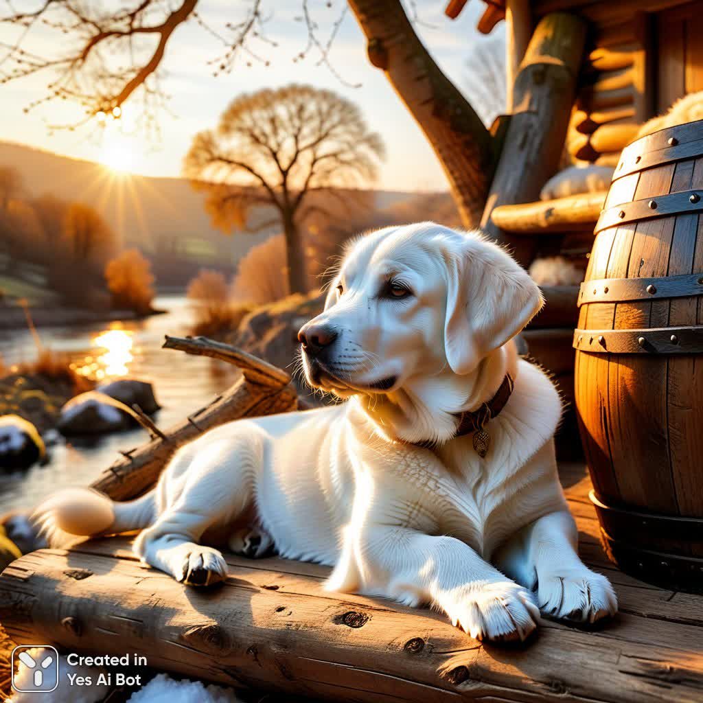Умиротворенная картина заката над живописным пейзажем: на большом дубовом бочче, словно уютный коврик у покосившейся избушки, безмятежно спит пухлый белый щенячий лабрадор. Его короткие лапки и пушистый хвост небрежно свисают по краям бочки, создавая очаровательную композицию. Запечатленный крупный план позволяет рассмотреть мельчайшие детали: макротекстуру мягкой шерсти щенка, грубую фактуру старого дерева бочки и приглушенные тона сепии, придающие снимку атмосферу старины и нежности. Вдали виднеется обрыв, уходящий вниз к извилистой реке, а весенние ветви деревьев добавляют картине свежести и жизни. Небольшие сугробы снега, оставшиеся от зимы, контрастно выделяются на фоне пробуждающейся природы, создавая ощущение тепла и надежды. Общее впечатление – спокойствие, умиротворение и безграничная любовь к миру вокруг. Снимок словно застывшее мгновение счастья, передающее всю прелесть момента и красоту простого деревенского быта. Эта сцена вызывает чувство ностальгии и желание окунуться в мир гармонии и покоя. Это иллюстрация теплоты, уюта и беззаботности, где каждый элемент создает неповторимую атмосферу спокойствия и радости
