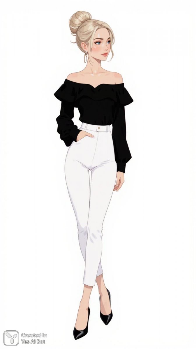 2. fashion illustration of woman in black off-the-shoulder blouse with ruffled sleeves, paired with white high-waisted trousers, wearing elegant black stilettos, hair styled in a sleek bun, BG is minimalist white, capturing modern chic style.