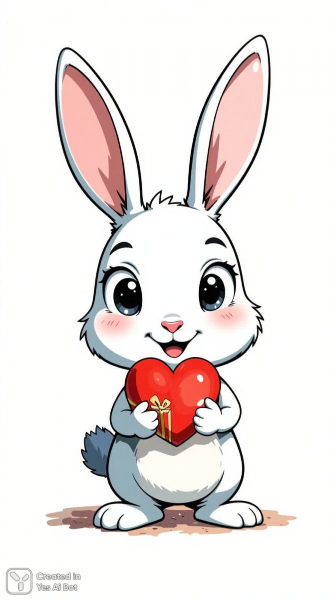 Забавный мультяшный кролик с большими выразительными глазами широко улыбается, излучая позитив и радость. В лапках он нежно держит ярко-красное сердце – символ любви и привязанности, а рядом расположилась небольшая подарочная коробочка, намекающая на приятный сюрприз или неожиданное проявление внимания. Фон выполнен в чисто белом цвете, что позволяет полностью сосредоточиться на милой фигурке кролика и деталях его аксессуаров. Рисунок выполнен в стилизованной манере черного контурного эскиза с минималистичными элементами, подчеркивающими простоту и очарование изображения. Использование динамичных линий придает композиции ощущение движения и энергии, делая кролика еще более живым и привлекательным. Этот персонаж идеально подойдет для открыток, иллюстраций в детских книгах или оформления социальных сетей, создавая атмосферу тепла и позитива. Он излучает беззаботность и счастье, вызывая улыбку у зрителя любого возраста. Изображение кролика символизирует доброту, надежду и искреннюю радость, а его милый вид не оставит равнодушным никого