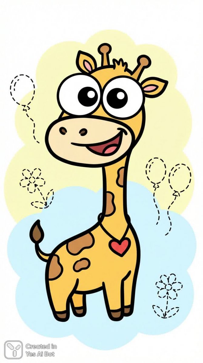 Очаровательный мультяшный жираф излучает безграничное счастье и позитив, создавая атмосферу радости и умиления. Его большие круглые глаза выражают искреннюю доброту, а широкая улыбка заражает оптимизмом. Игривый персонаж гордо стоит на светлом фоне, украшенный ярким красным сердцем, нежно повязанным вокруг шеи – символом любви и тепла. Стиль иллюстрации выполнен в четких контурах, что придает изображению легкость и воздушность. Этот жизнерадостный жираф идеально подойдет для оформления детских товаров, открыток, плакатов или любого проекта, где требуется добавить немного волшебства и беззаботности. Он словно приглашает зрителя окунуться в мир фантазий и позитивных эмоций, даря ощущение тепла и уюта. Яркий акцент на сердце подчеркивает его нежность и доброжелательность, делая этот образ запоминающимся и любимым. Этот персонаж – воплощение радости и оптимизма, способное поднять настроение даже в самый пасмурный день. Его игривый характер и привлекательный внешний вид делают его идеальным выбором для создания позитивного контента любого формата