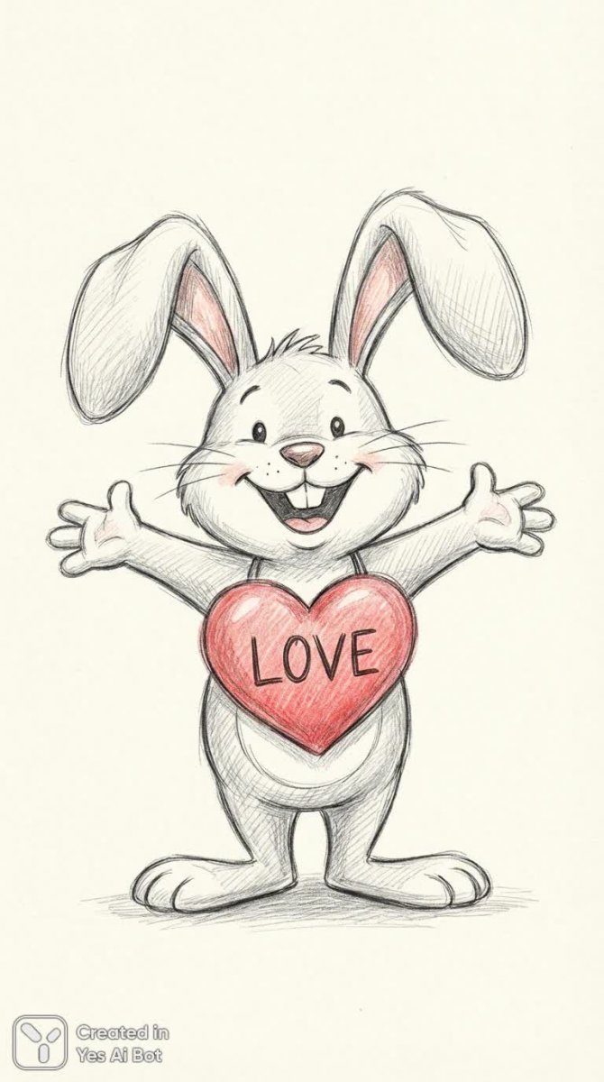 cartoon bunny with big ears and wide smile, standing with arms open, holding red heart with "L0VE" text, plain white BG, sketch style, light shading, adorable illustration, cheerful atmosphere.