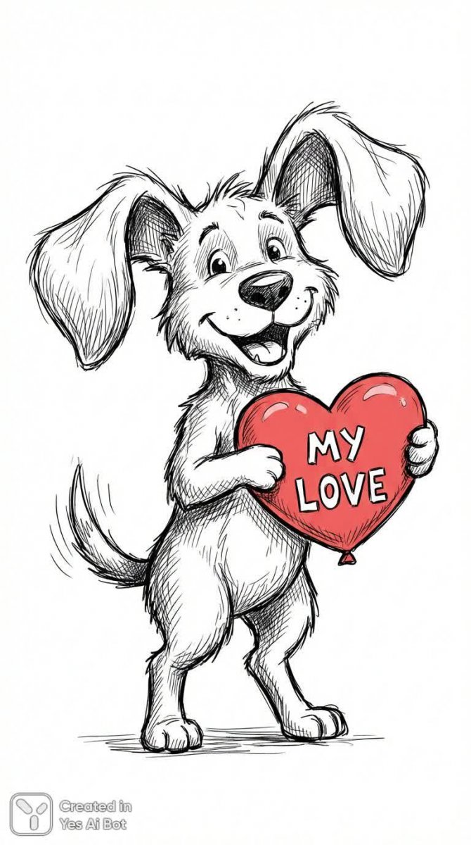cheerful cartoon dog, big floppy ears, standing upright with wagging tail, holding red heart with "MY L0VE" text, minimalist white BG, black and white sketch, lively character, friendly aura.