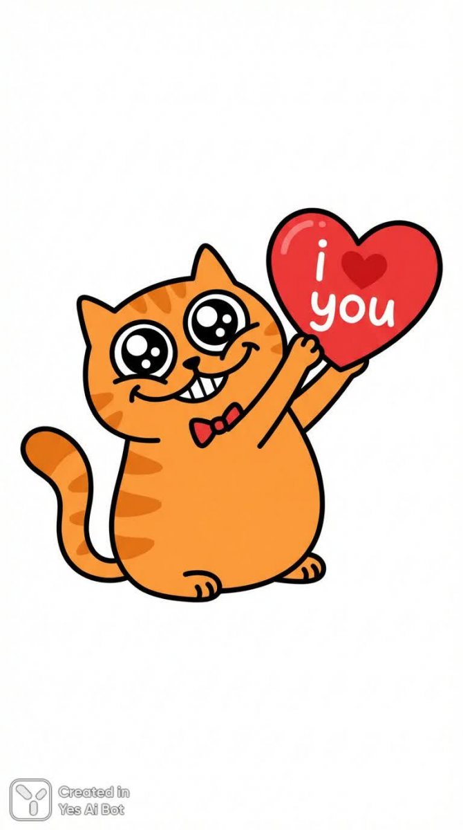 cute cartoon cat with orange fur, oversized eyes, grinning, holding a red heart marked "i ❤ you", plain white BG, outline style, fun illustration, minimalism, vibrant colors.