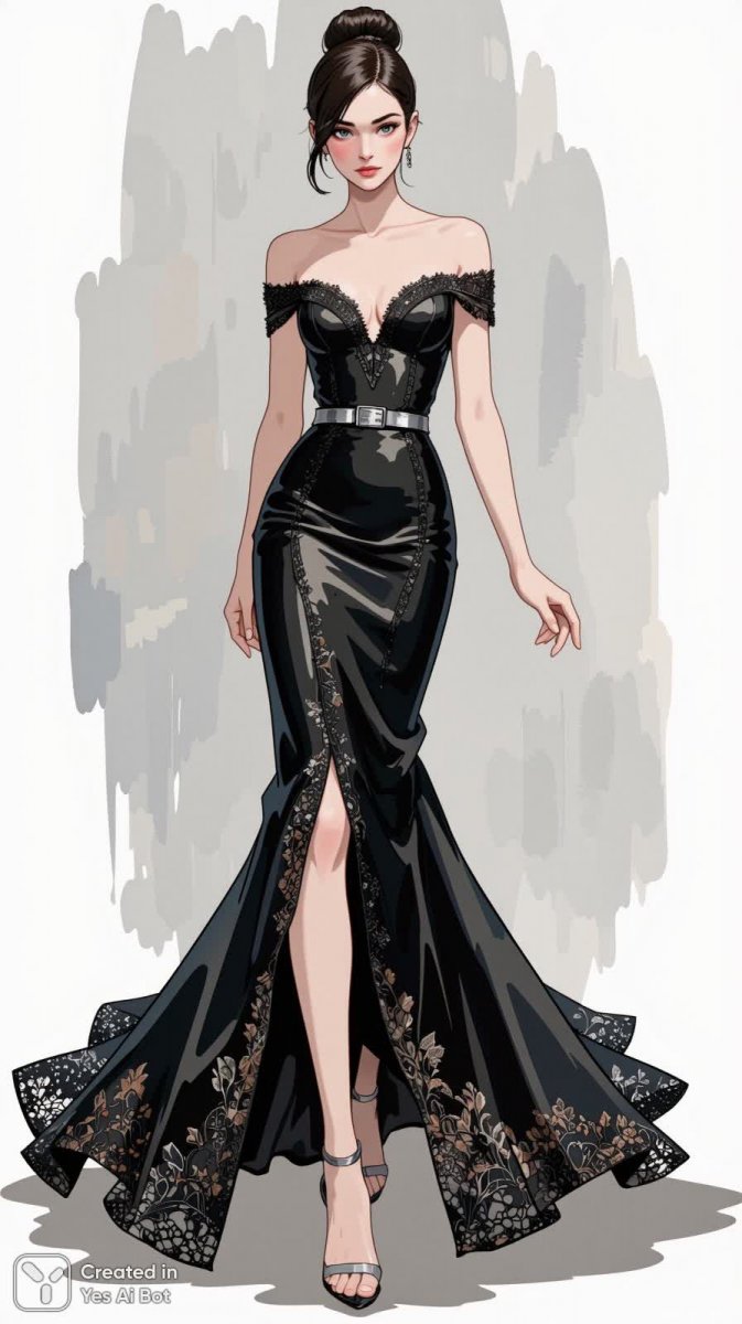 Изысканная мода оживает в деталях этого иллюстративного портрета. Женщина предстает в роскошном черном платье, воплощающем элегантность и утонченность. Платье отличается сложным кружевным декором, подчеркивающим женственность силуэта. Линия плеч открыта, создавая эффект легкости и воздушности, а ниспадающий шлейф придает образу драматизма и величия. Талия акцентирована серебряным поясом, добавляющим нотку блеска и изысканности. Изящные туфли на тонких ремешках завершают ансамбль, подчеркивая грацию и легкость движений. Прическа – гладкий пучок, демонстрирует сдержанность и элегантность. Фон выполнен в приглушенных серых тонах, не отвлекая внимание от основной темы – красоты и великолепия женского образа. Иллюстрация передает атмосферу высокой моды и подчеркивает мастерство исполнения. Это визуальная ода изысканности и безупречному стилю. Она идеально подойдет для демонстрации последних тенденций в мире моды, как образец элегантного вечернего наряда или просто как произведение искусства. Каждая деталь тщательно проработана, создавая впечатление реалистичности и глубины. Это не просто иллюстрация, это – запечатленный момент красоты и вдохновения