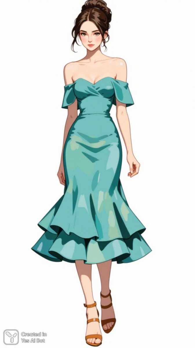 4. fashion illustration of woman in teal off-the-shoulder dress with ruffled hem, fitted at waist, wearing tan strappy heels, hair styled in elegant updo with tendrils framing the face, BG is white.