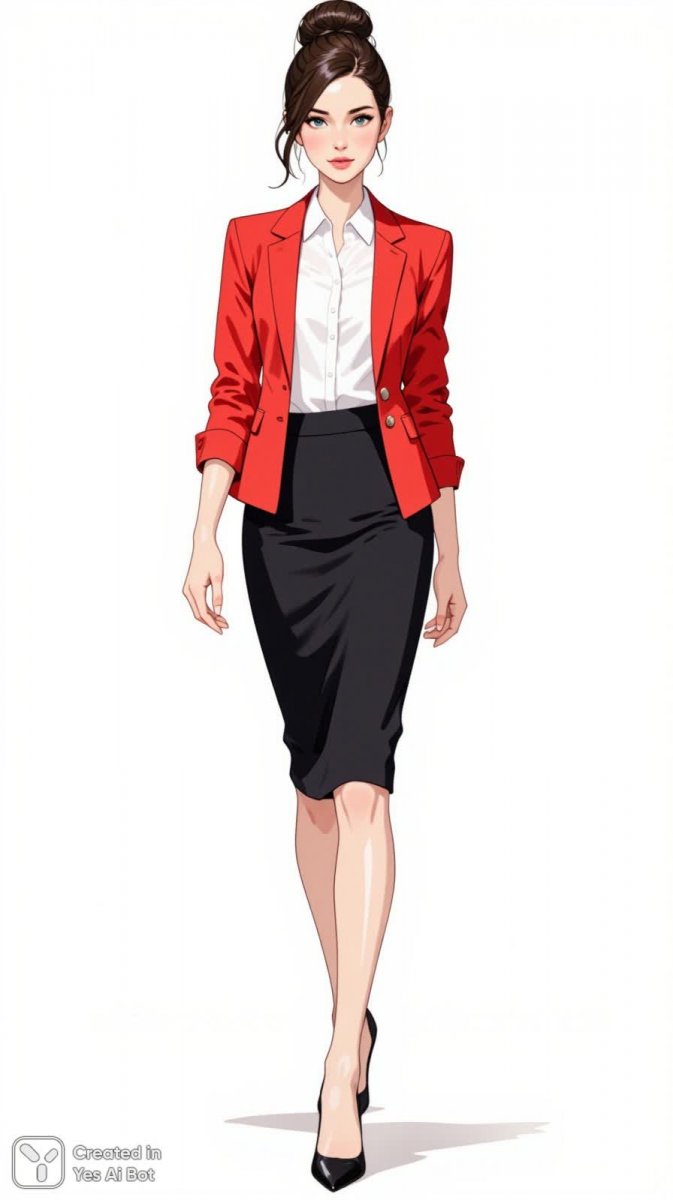 5. fashion illustration of woman in fitted red blazer over a classic white blouse, paired with tailored black pencil skirt, wearing black stiletto heels, hair styled in a sophisticated bun, BG is plain white.