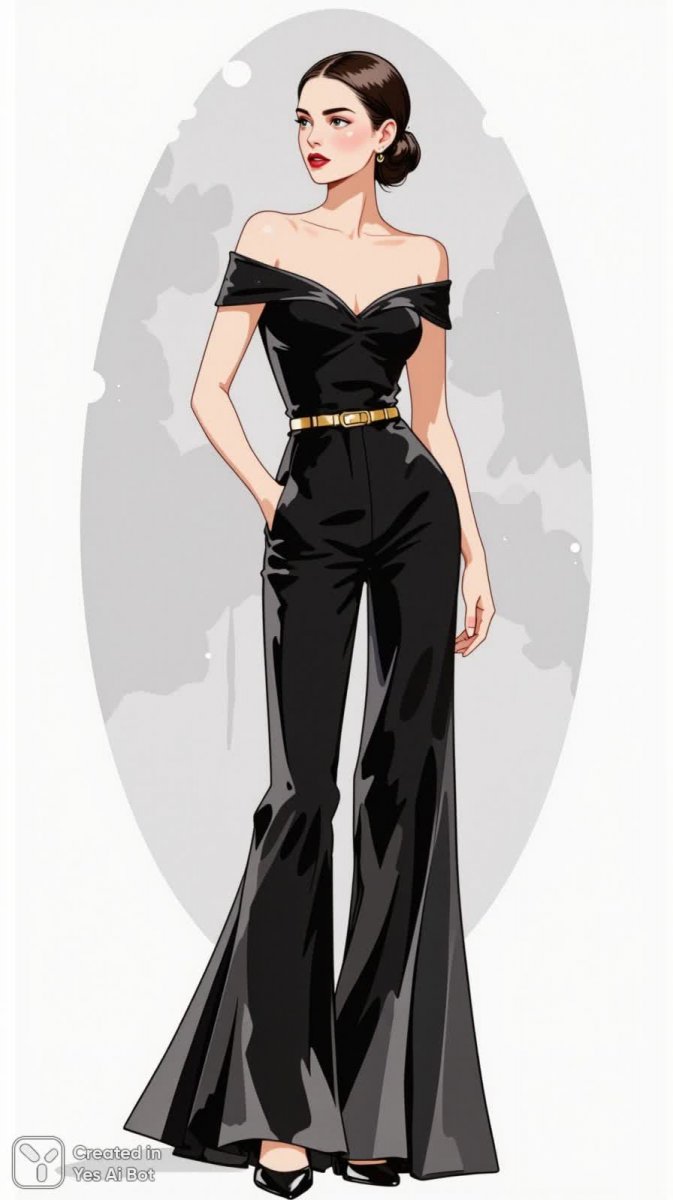 fashion illustration of woman in elegant black jumpsuit, cinched at waist with gold belt, featuring off-the-shoulder design, wearing bold red lipstick, hair styled in sleek updo, BG is light gray.